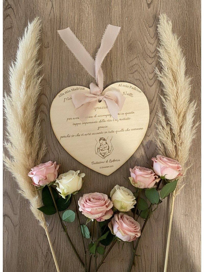 Questo cuore in legno inciso è un dono raffinato e ricco di significato, pensato per ringraziare padrino e madrina nel giorno del battesimo.