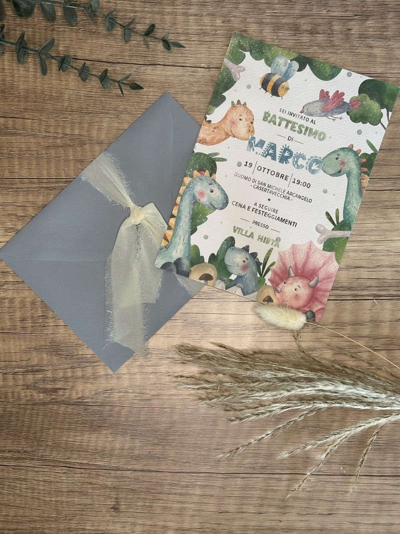 L’invito Battesimo “Dinosauri” è perfetto per chi vuole unire tenerezza infantile e raffinatezza, creando un ricordo speciale di un giorno importante, raccontato con dolcezza e un pizzico di fantasia.