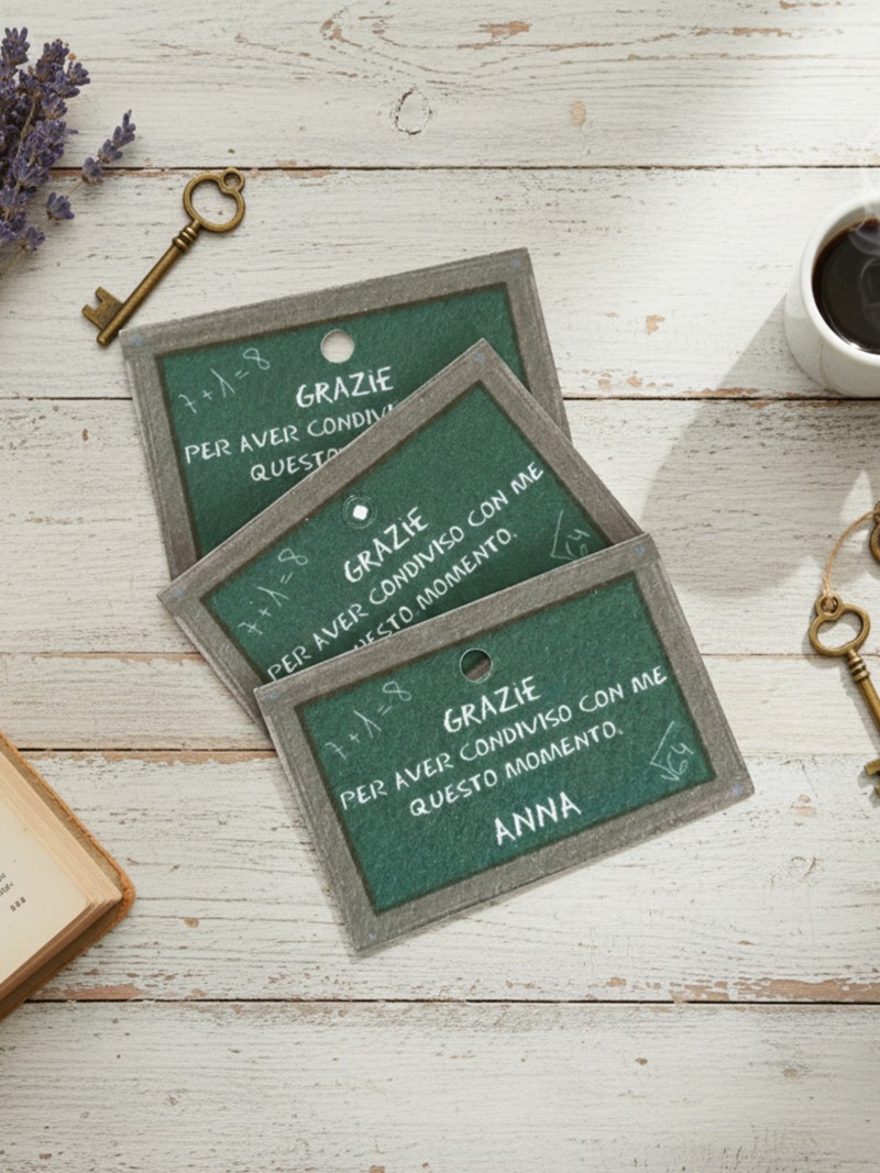 Il tag personalizzato effetto lavagna è un piccolo dettaglio che racconta un grande momento.