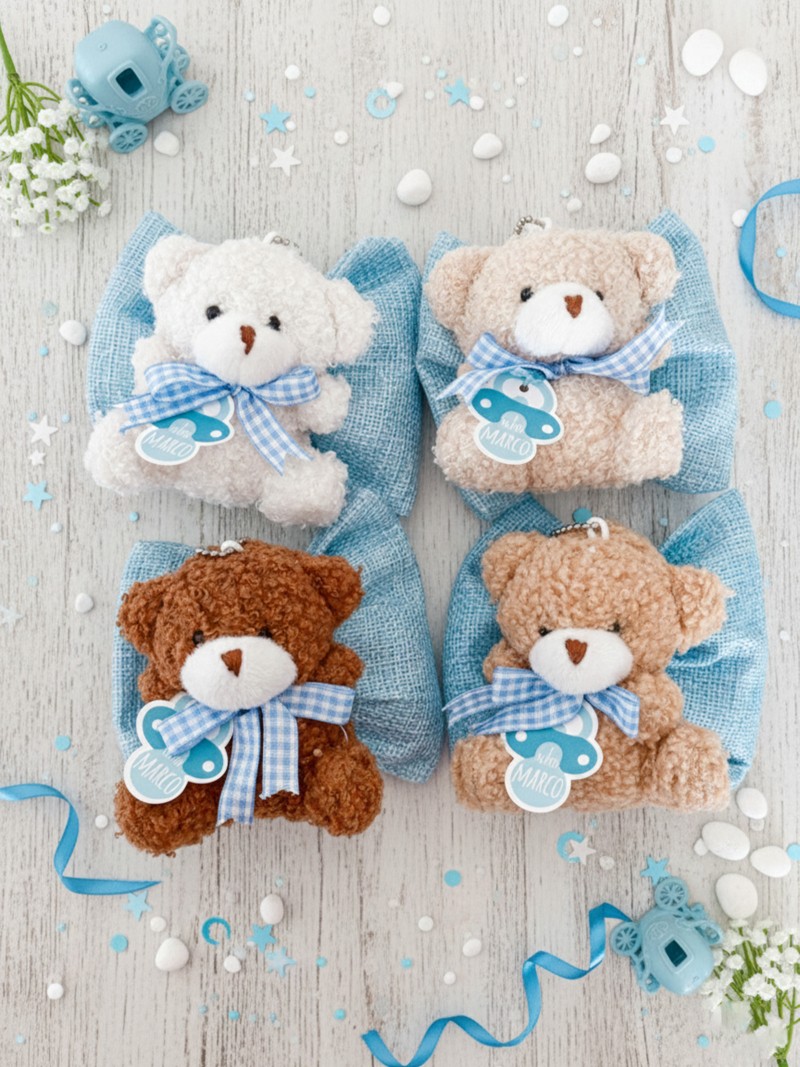 Dolcissima bomboniera nascita con orsetto in peluche, perfetta per celebrare l’arrivo di un bambino con un ricordo tenero e raffinato.