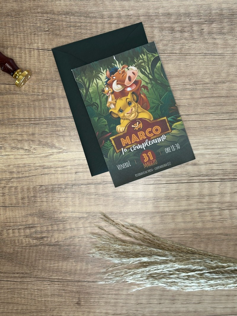 Rendi speciale l’invito alla festa del tuo bambino con questo invito a tema giungla ispirata al mondo del Re Leone.