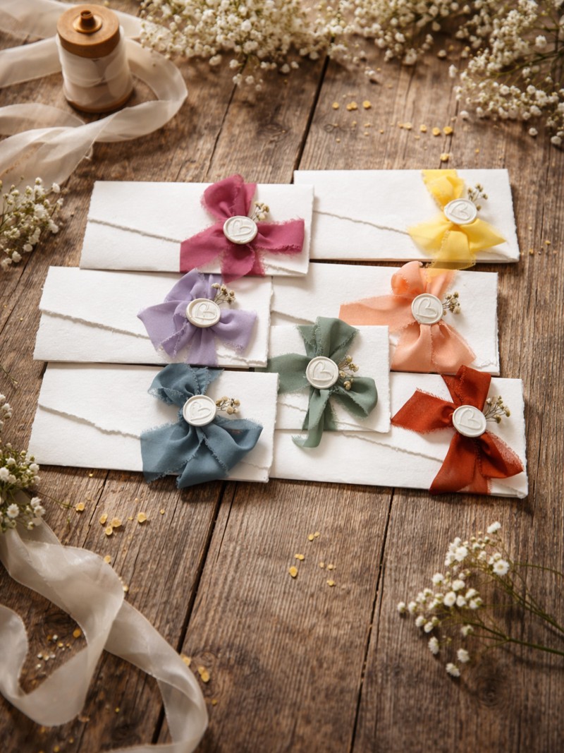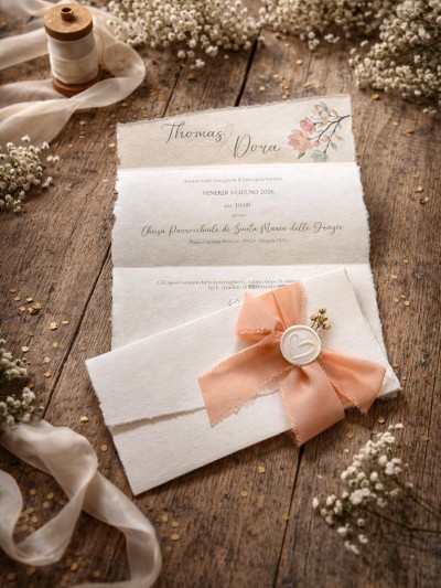 Il modello è impreziosito da un nastro in seta sfrangiata, disponibile in diverse tonalità, e da un sigillo in ceralacca personalizzato con iniziali o monogramma degli sposi.