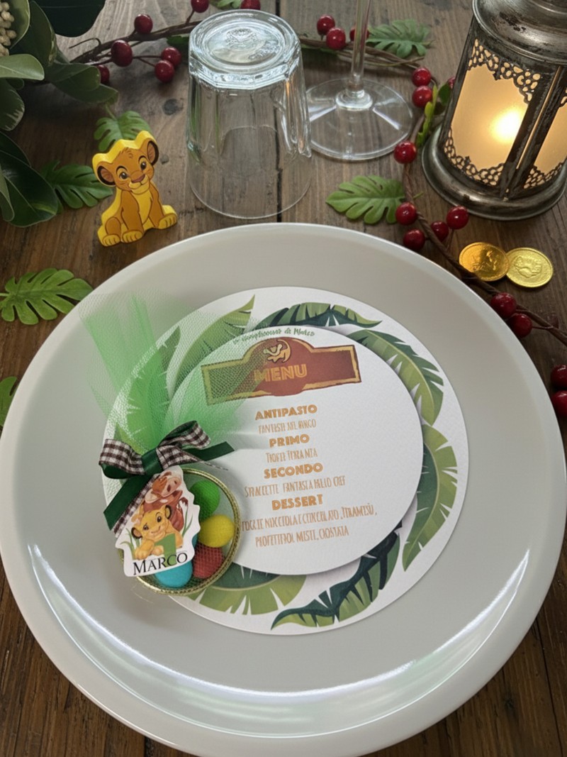 La grafica tropicale con foglie verdi e personaggi ispirati al mondo del Re Leone si abbina a un simpatico gadget con confetti colorati, creando un coordinato allegro e raffinato allo stesso tempo.