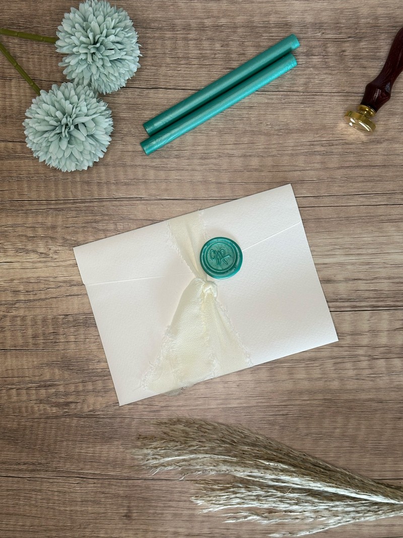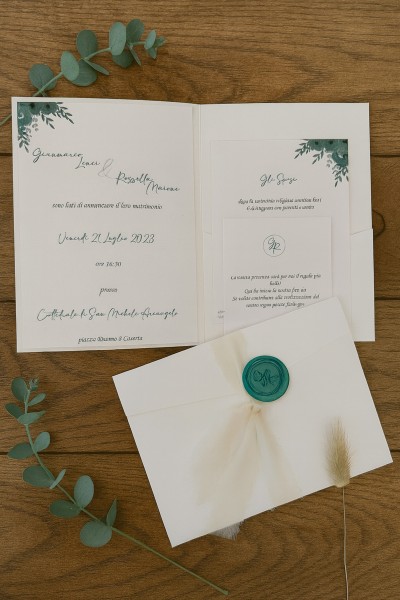 La chiusura con sigillo in ceralacca verde dona un tocco artigianale e prezioso, rendendo ogni partecipazione unica.