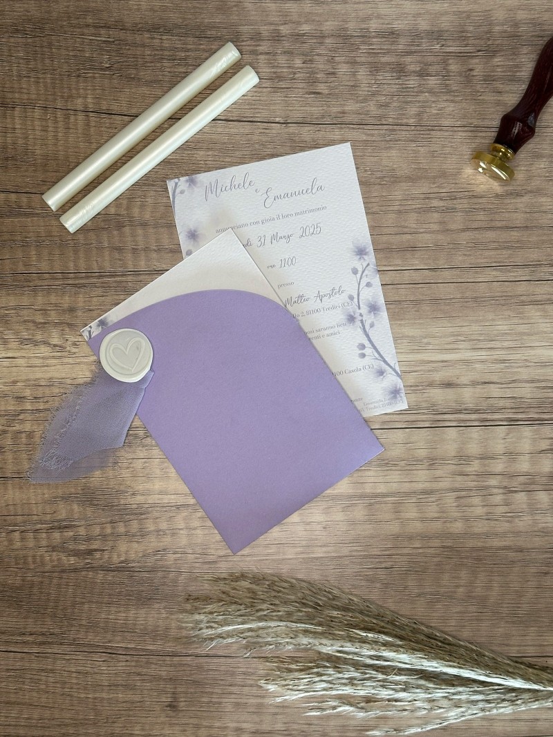 La partecipazione “Lillibeth” è realizzata con una busta a portafoglio artigianale, caratterizzata da un raffinato taglio a semicerchio in una dolce tonalità lavanda, che dona al coordinato un aspetto armonioso e femminile.