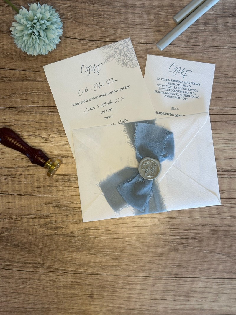 Il tocco distintivo è dato dal nastro in chiffon azzurro polvere, che avvolge la busta con un nodo morbido, sigillato da un raffinato sigillo in ceralacca personalizzato.