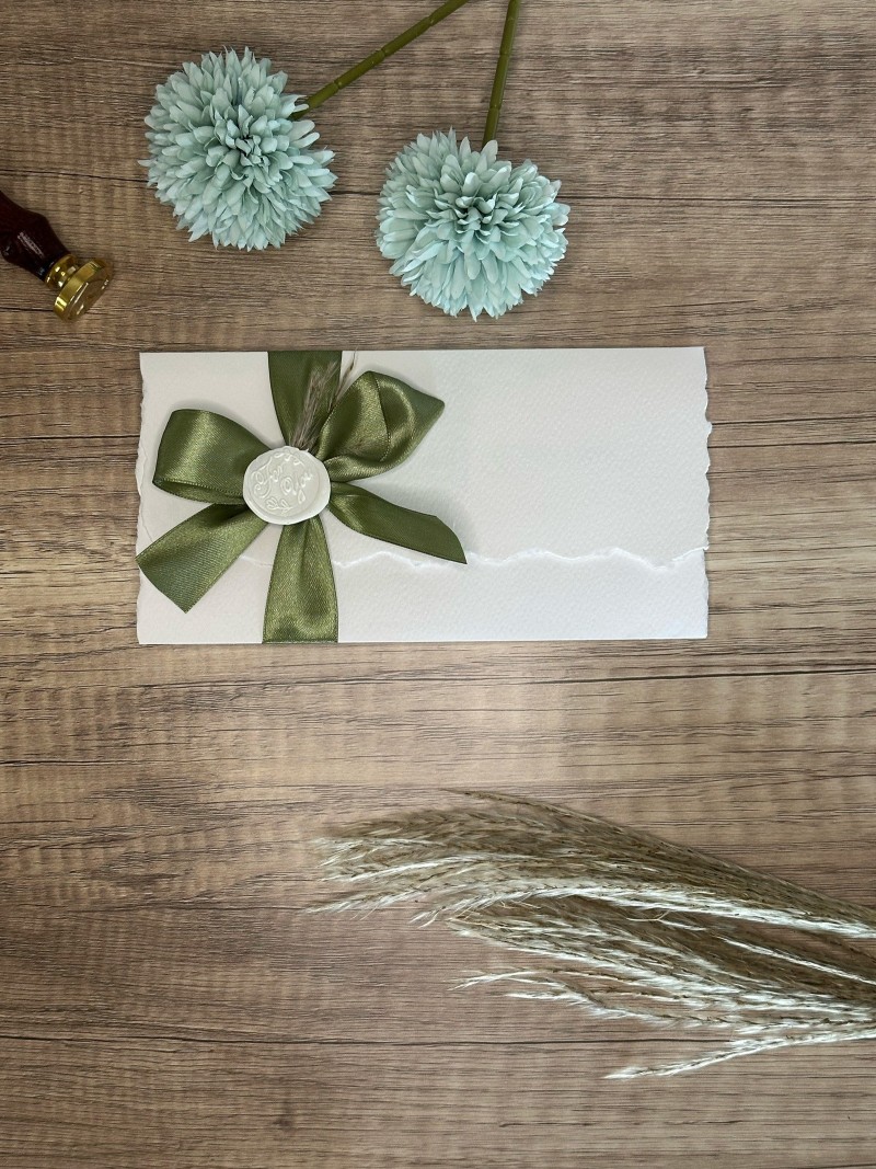 La partecipazione “Oliva” è realizzata su carta Tintoretto sfrangiata a mano, con bordi irregolari che valorizzano la lavorazione artigianale e donano unicità a ogni pezzo.