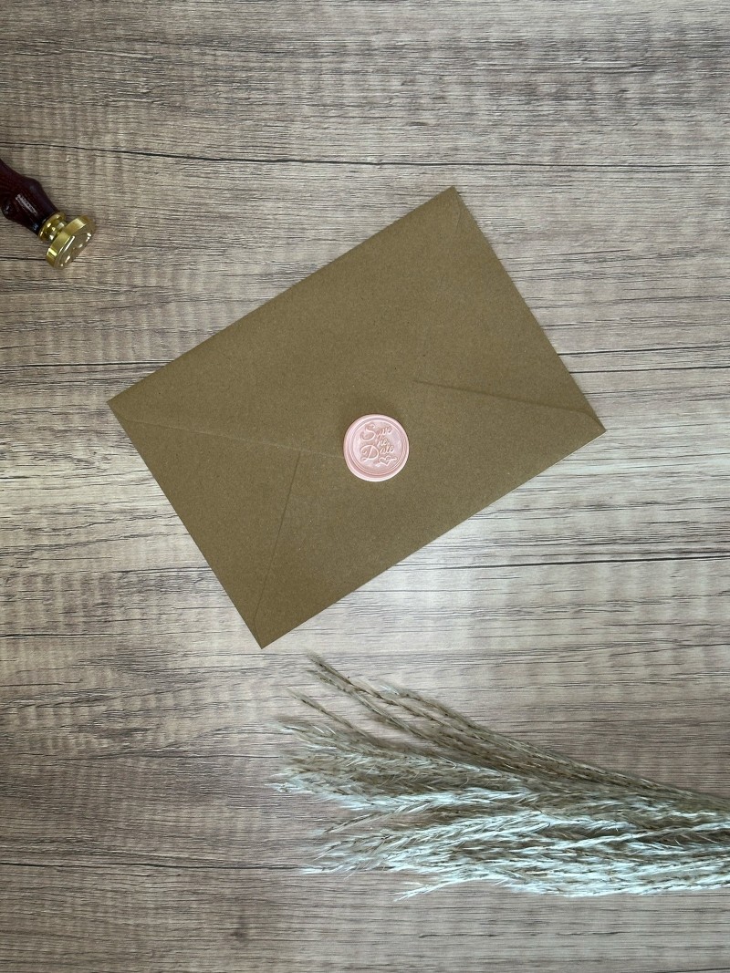 Il tutto è rifinito da un elegante timbro in ceralacca, che sigilla la partecipazione con un tocco artigianale e scenografico, rendendo ogni invito unico e memorabile.