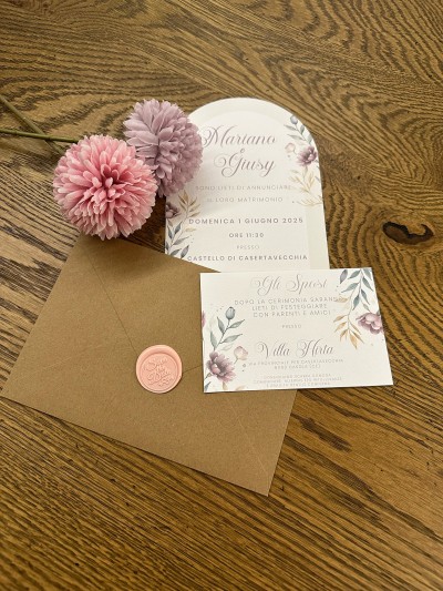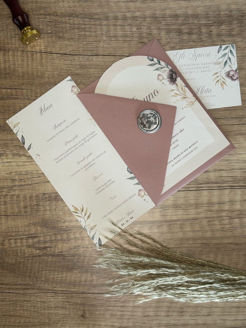 La busta in carta artigianale rosa o in carta Kraft con chiusura a sigillo in ceralacca, custodisce un invito realizzato in carta Tintoretto a semicerchio impreziosito da illustrazioni floreali e da un info card.