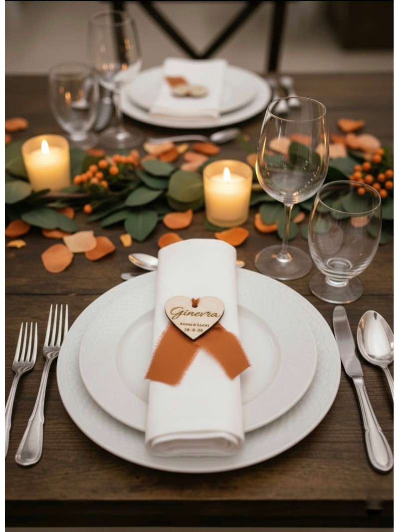 Il Segnaposto Cuore è un complemento dal fascino rustico-chic, pensato per chi desidera aggiungere un tocco caldo e autentico alla tavola del proprio evento.