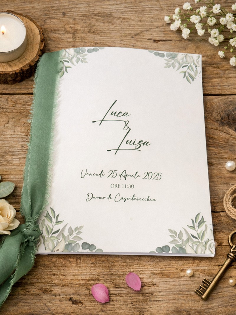 Stampata su carta soft touch avorio, avvolta da un vellum trasparente con stampa floreale, e chiusa con un nastro in seta vegan verde salvia rifinito a mano.