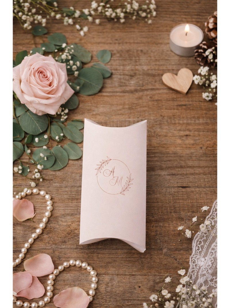 Elegante scatolina a forma di pillow box, impreziosita da un delicato monogramma botanico.